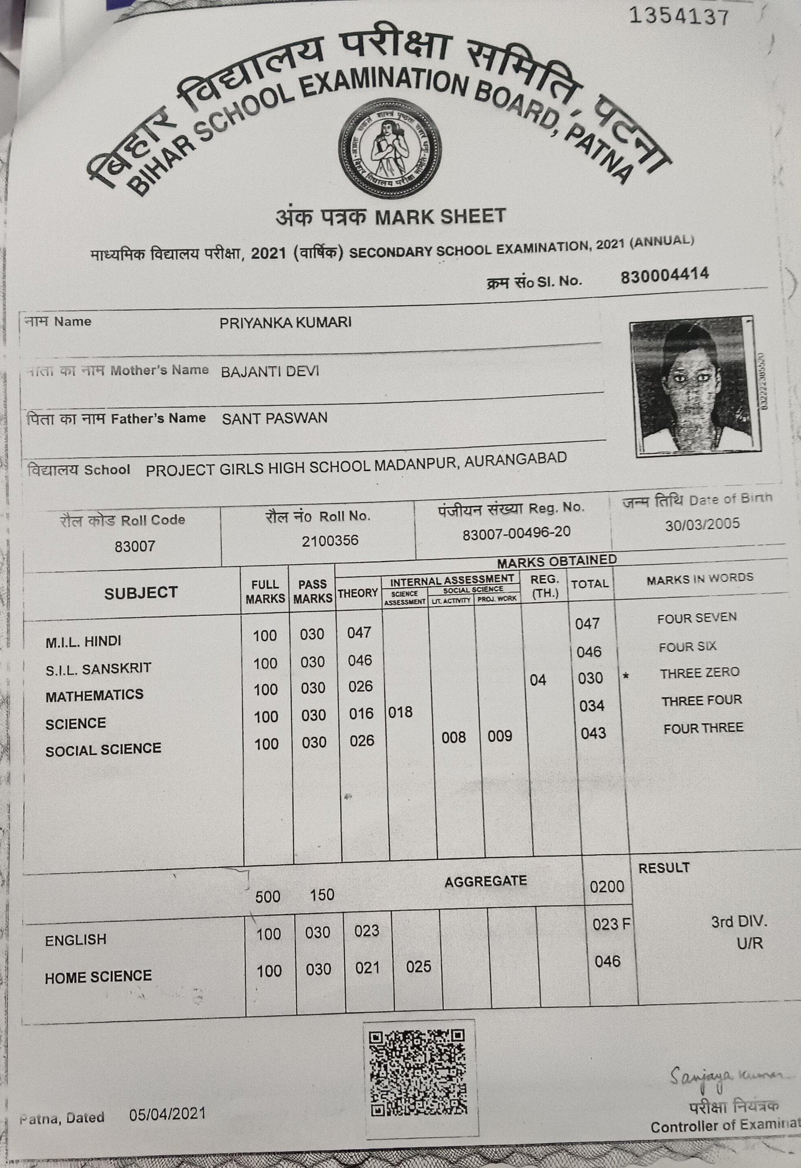 | Exam | Full Marks | Pass Marks | Marks Obtained |