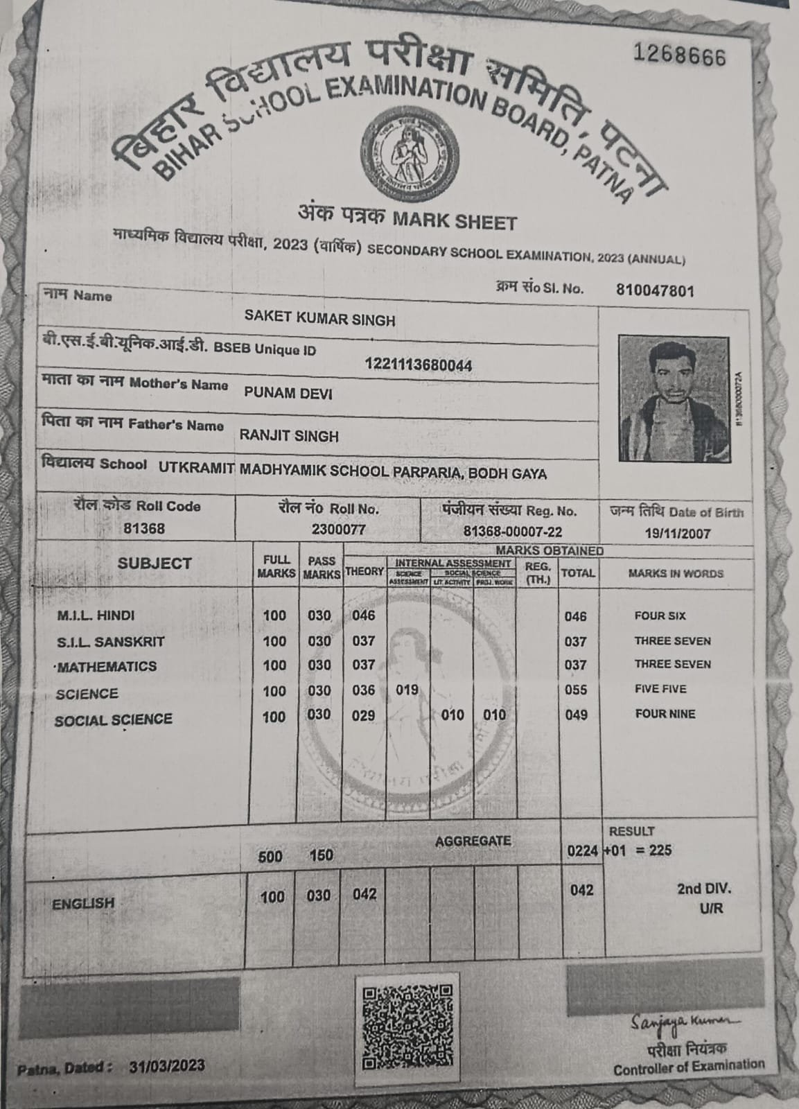 | Exam | Full Marks | Pass Marks | Marks Obtained |