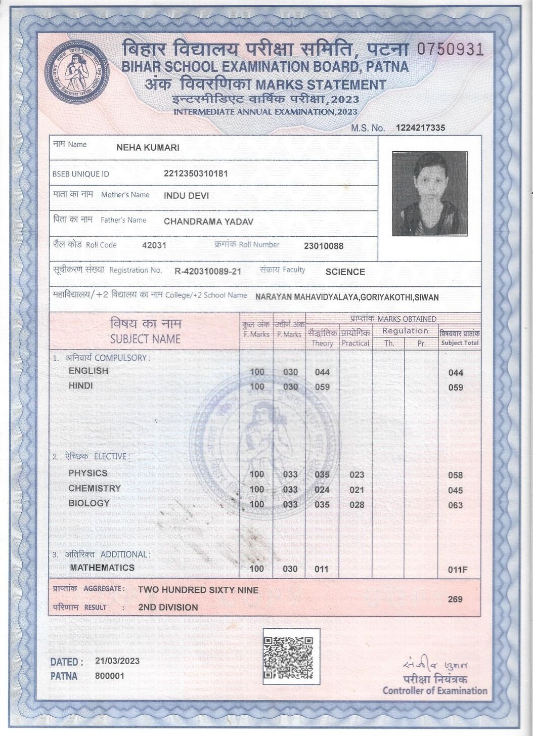 | Exam | Full Marks | Pass Marks | Marks Obtained |