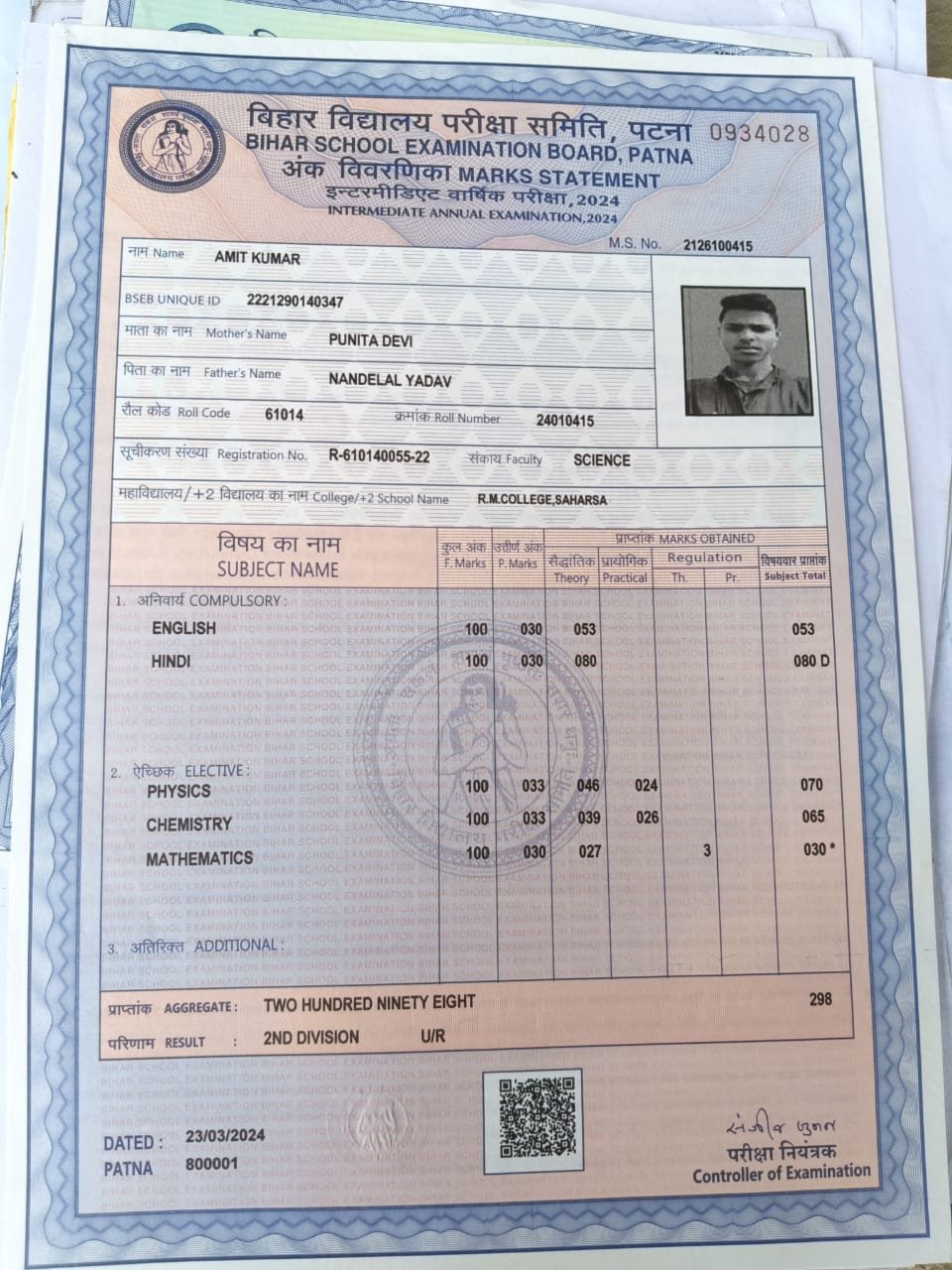 | Exam | Full Marks | Pass Marks | Marks Obtained |