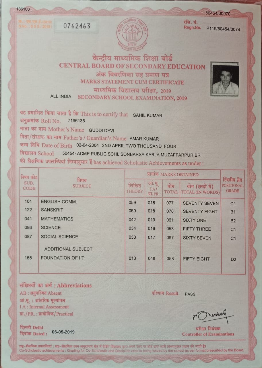 | Exam | Full Marks | Pass Marks | Marks Obtained |