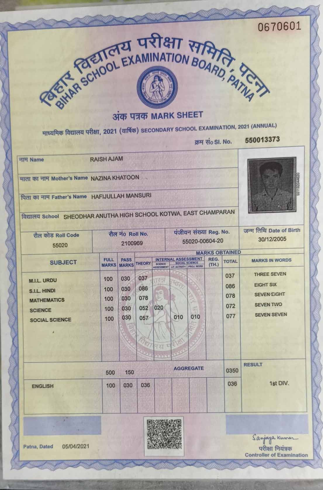 | Exam | Full Marks | Pass Marks | Marks Obtained |