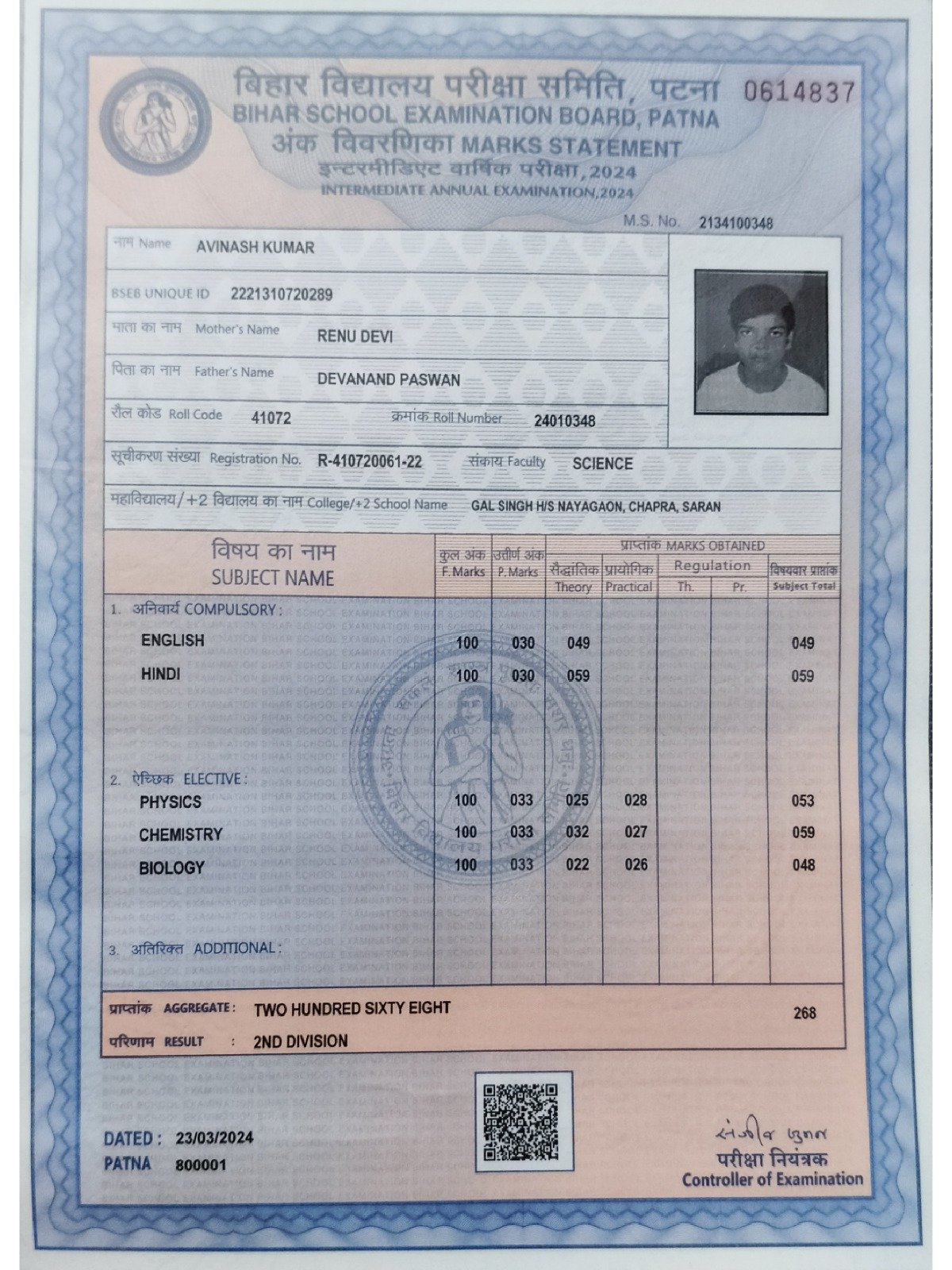 | Exam | Full Marks | Pass Marks | Marks Obtained |