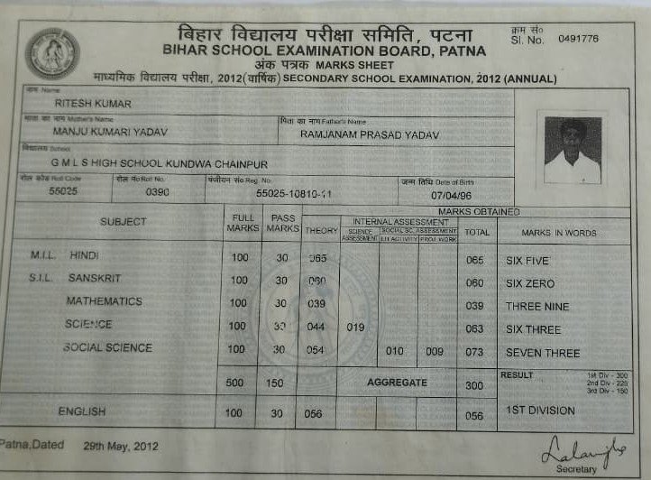 | Exam | Full Marks | Pass Marks | Marks Obtained |