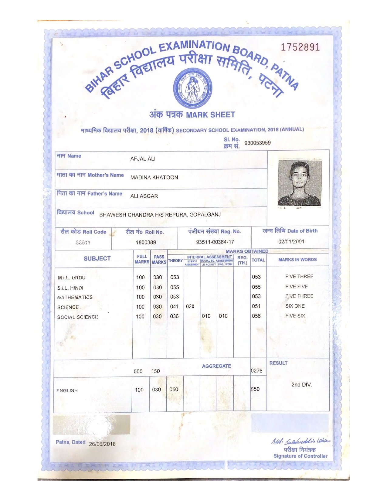 | Exam | Full Marks | Pass Marks | Marks Obtained |