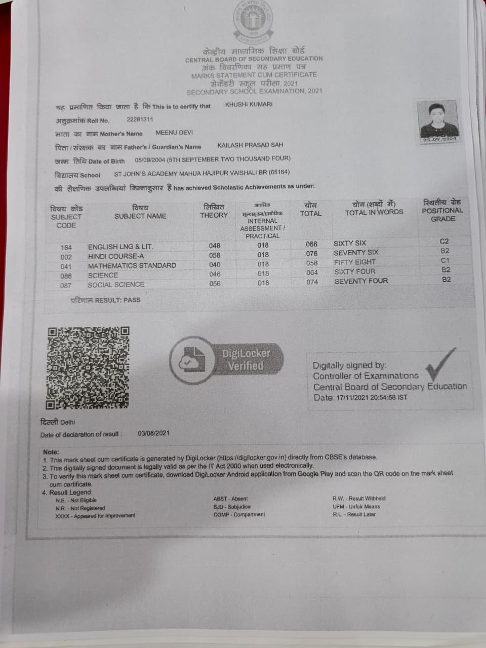 | Exam | Full Marks | Pass Marks | Marks Obtained |