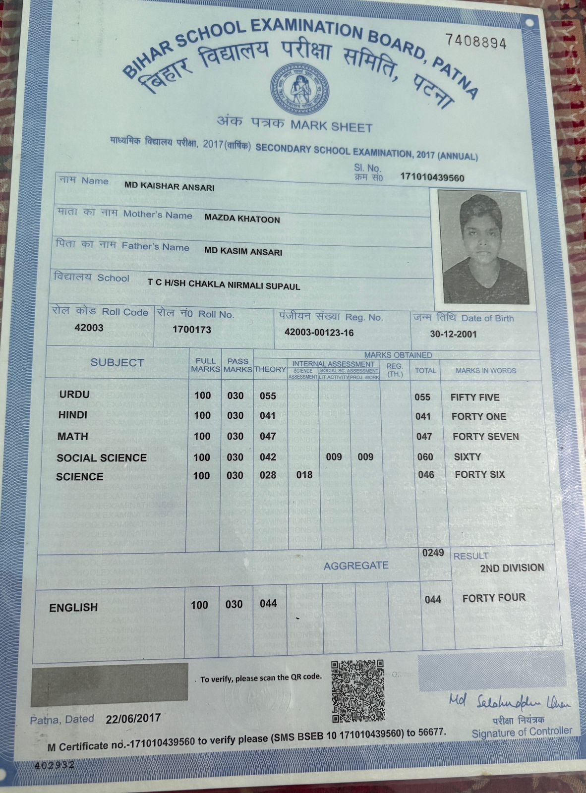 | Exam | Full Marks | Pass Marks | Marks Obtained |
